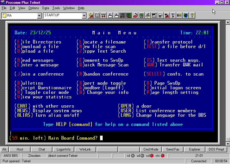 Throughout the 1980s, these concentrators evolved to support Ethernet, and remote terminals stopped connecting via direct RS-232, beginning instead to communicate through networks. In this context, the VT100 terminal standard, originally from DEC, became consolidated. BBSs and multi-user systems began adopting implementations compatible with this standard — often partial or with their own extensions — for text display, screen control and colors, with the most common format becoming known as ANSI BBS. This compatibility allowed different terminals and microcomputers to access systems in a uniform way, and this set of codes based on ANSI/VT100 eventually became a de facto standard, still widely used today in terminal emulators, Telnet connections and Unix environments.